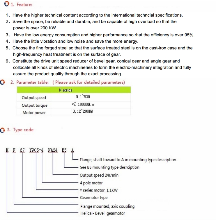 4. It can equipped with DC motor, stepper motor, torque motor, water proof motor, Metallurgy lifting motor, variable- frequency motor, electromagnetic speed regulating motor and so on.Helical- bevel gearmotor K series
